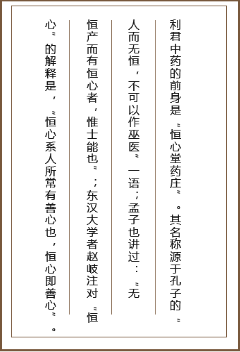 • 利君中藥具有近400年的悠久歷史。公司前身“恒心堂藥莊”始創(chuàng)于明朝末期,興盛于清代、民國(guó),其招牌產(chǎn)品“坎壢妙濟(jì) 丹”、“參茸固本還少丹”功能獨(dú)特、療效神奇,享譽(yù)廣大西部地區(qū),有“神農(nóng)妙濟(jì)”之美譽(yù),歷代名人左宗棠、于佑任、 屈武等都留有書聯(lián)贊譽(yù)。民國(guó)時(shí)期,“恒心堂”在西北5省及山西、四川、云南均設(shè)有分號(hào),坐大西部藥界,同北京“同仁 堂”、浙江“胡慶余堂”、廣州“陳李記”一起,被稱為“四大藥莊”,是國(guó)內(nèi)為數(shù)不多的幾家具有數(shù)百年歷史的中藥“老 字號(hào)”之一。